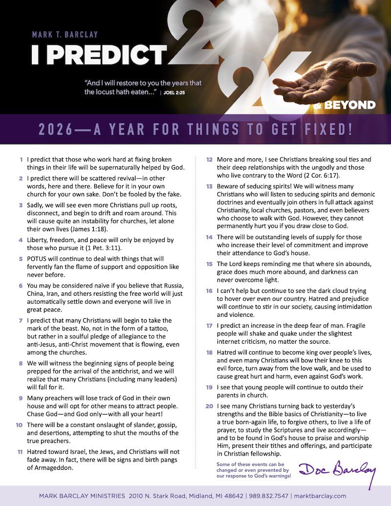 Every year, Dr. Barclay takes time to document what the Lord is revealing to him about the upcoming year and beyond. These predictions are available to you to take before the Lord in prayer in response to His warnings.